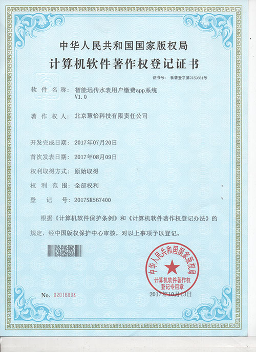 祝贺慧怡科技智能远传水表用户缴费app系统V1.0获得专利批准,由中华人民共和国国家版权局授予颁发,慧怡将再接再厉。