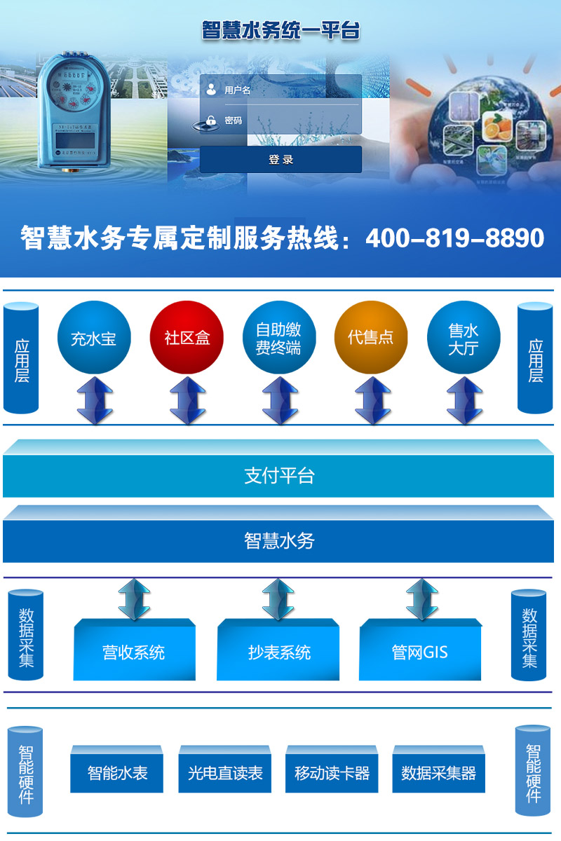 慧怡智慧水务解决方案|城市水务物联网系统|水务信息化管理平台方案方案的研发,涵盖城乡供水中的水源地取水、水厂制水、管网输水、用户用水等各个环节,以节能降耗、减员增效和精细管理为根本出发点,是水司实现智慧化运营的重要途径。一直专注于智慧水务领域的北京慧怡科技有限责任公司,一方面持续发力自主研发,另一方面紧跟市场步伐,打造了一整套有利于创新的完善体系。NB远传水表选用NB-IOT窄带物联网,是一种革新技术,它支持海量连接、深度覆盖、超低功耗、较低成本和稳定可靠,同时它能够支持微信支付宝手机APP等多种缴费方式,既方便了用户也提高了水务公司的水费回收率。